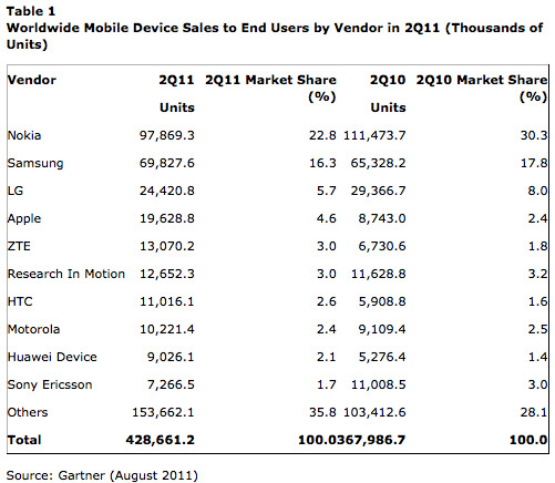 Smartphone sales to end users, a totally different number than what's quoted above as final sales, were up a whopping 74 percent when compared to last year. This number of sales to end users accounts for 25 percent of overall sales in the second quarter of 2011, this again a gigantic 17 percent increase from the same period last year. The changes in sales for most of the devices on the big list of brands here in this Gartner study tell a different story.