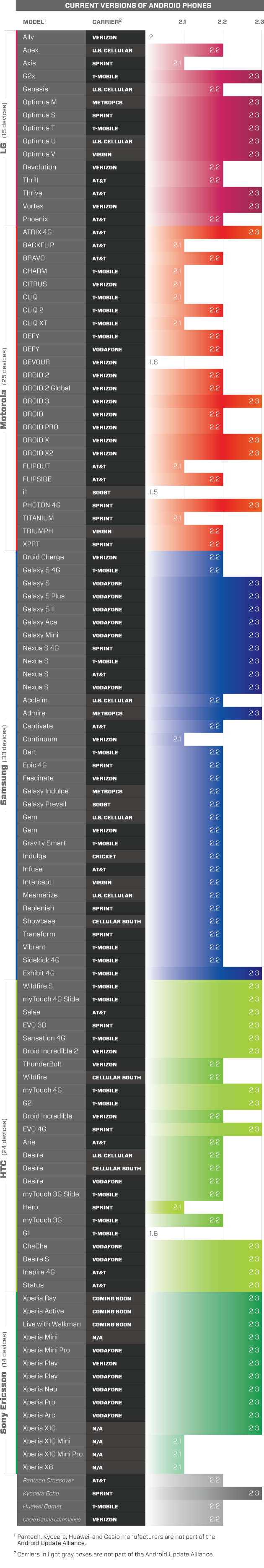 As far as how many updates have been sent out to devices per manufacturer, it's a slightly different story, with HTC again in the lead, but only by a bit, having 14 devices updated out of 24 since the Google I/O announcement. Next theres Samsung with 13/33, Motorola with 10/25, LG with 9/15, and Sony Ericsson with 4/14 in total. Finally there's a big giant list again whipped up by Shapcott which shows every single active Android device out there attached to which version of Android they are currently running (as seen in the gallery below). What do you think?