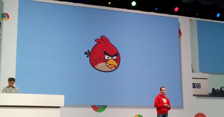 The Mighty Eagle took the stage at Google I/O during the second day's keynote to raving applause, his bright red hoodie with Angry Bird in tow. His announcement was that Angry Birds was coming to the biggest platform of all – the web. This version of Angry Birds will be running on Chrome to begin with and will be released in a Beta version. This version will be released at 60 frames per second easily (meaning it'll probably be better, if you know what i mean,) and it's built in WebGL. It also supports canvas, HD experience works, and it just plays so well!