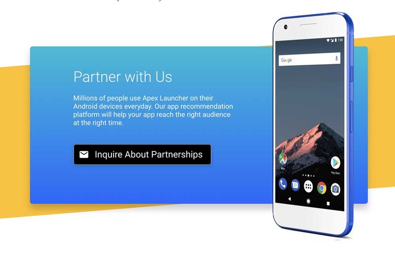 "Partner with Us — Millions of people use Apex Launcher on their Android devices everyday. Our app recommendation platform will help your app reach the right audience at the right time."