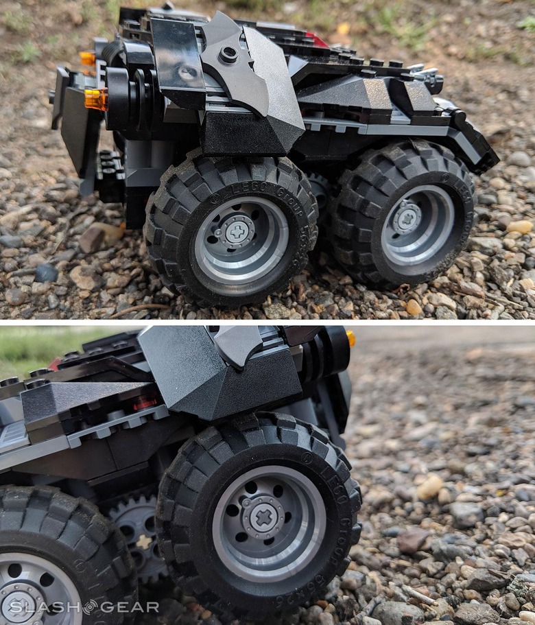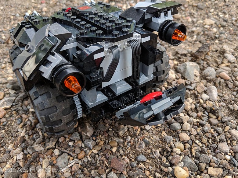 The power under the tail-hood here feels better suited to a LEGO train – if you're used to driving higher-powered remote-controlled cars. If you've never used a remote controlled vehicle before, this Batmobile should seem real nice and swift! The torque with which this vehicle can operate seems to be right in-line with how fast the vehicle could go before crashing would result in broken bricks.
