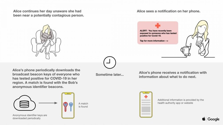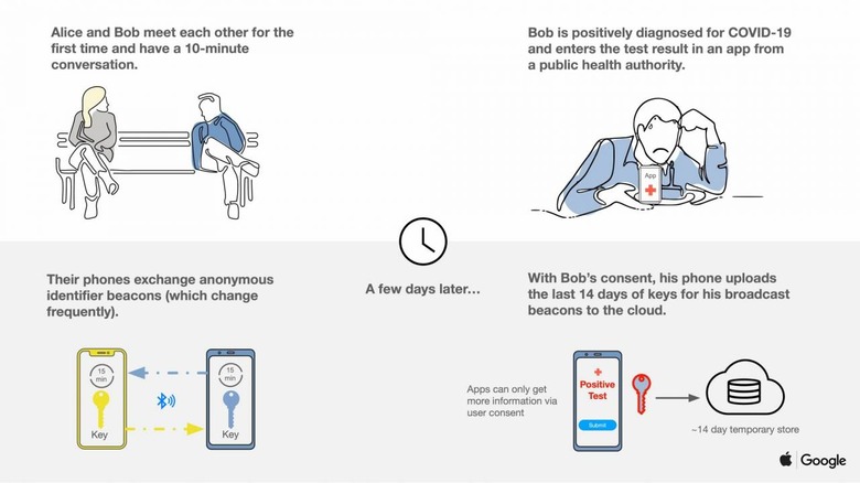 Contact tracing aims to step back through an individual's movements, and track who they might have come into contact with and – if they later have a positive coronavirus diagnosis – inform those people that they may need to be tested. Google and Apple's idea was to use a new API for Bluetooth, that would create ongoing logs on users' phones that stored who they'd been near over the past fourteen days. Should they later come up positive on a COVID-19 test, that information could be used to unlock the tracing data and automatically alert others in that log about the potential risk.