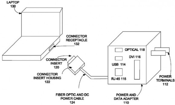 Apple doesn't suggest that the fiber optic technology it has in mind is actually Light Peak, but the company is known to be working with Intel on the new system. The idea to combine a fiber optic link with power would allow for a broader range of ports on a multi-function AC adapter, as in Apple's illustration above, as well as taking advantage of the easily-detached magnetic port.