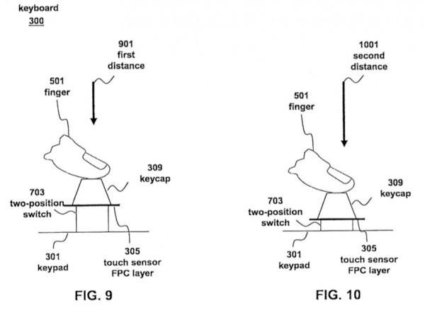 The obstacle with this technology would be how to determine when physical contact is made with a key is meant as a touch gesture, or as the beginning of a physical press. The patent describes one solution as being time-based, meaning if the key "F" is touched, a physical key depression must be made within a certain amount of time to recognize a keystroke, otherwise it would be a touch input.