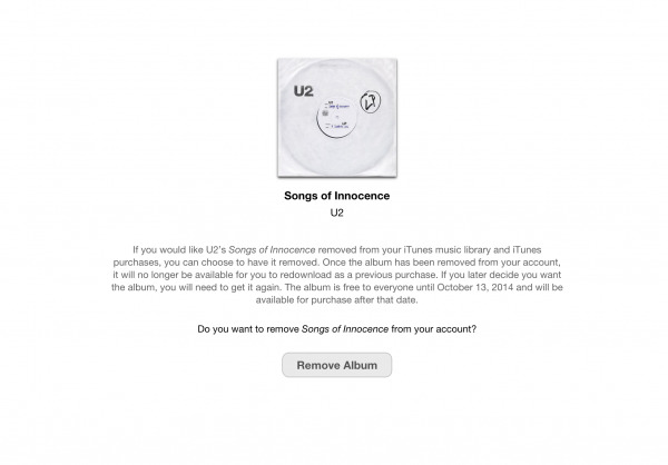 Supposing you didn't actually want a new U2 album in your iTunes library, Apple has heard your plea for help. They've created a unique link which does all the heavy lifting for you – deleting the album U2 "Songs of Innocence" from your library with ease.