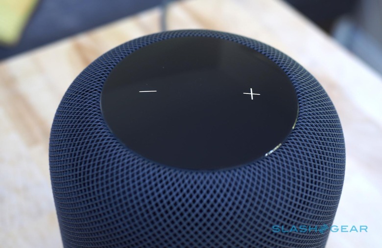 HomePod's top panel caters for the basics. Tap the center briefly, and it toggles play/pause; double-tap, and HomePod skips forward a track, while a triple-tap skips back one. Plus and minus buttons handle volume, while a long-press in the middle starts Siri listening. When you do the latter – or, indeed, when you say "Hey Siri" – you get a ripple of colors that glow through the panel, courtesy of a cluster of LEDs underneath.