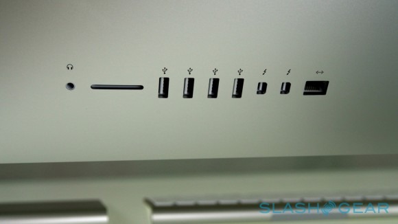 On the back, as before, there are the ports clustered to the left side and the power button on the right. No matter which size iMac you choose, you get the same connectivity: a 3.5mm headphone jack, an SDXC memory card reader, four USB 3.0 ports, two Thunderbolt ports, and a gigabit ethernet port; inside, there's WiFi a/b/g/n and Bluetooth 4.0. Up front, there's a FaceTime HD camera above the display, together with a pair of digital microphones that can use beam-forming technology to isolate your voice from ambient noise.