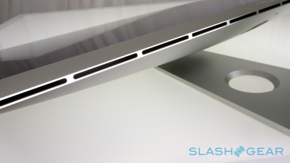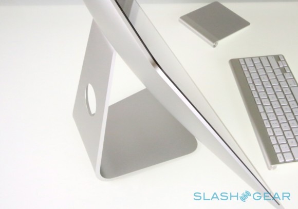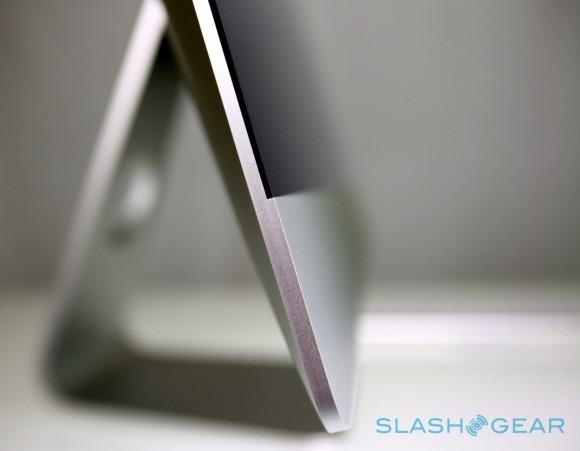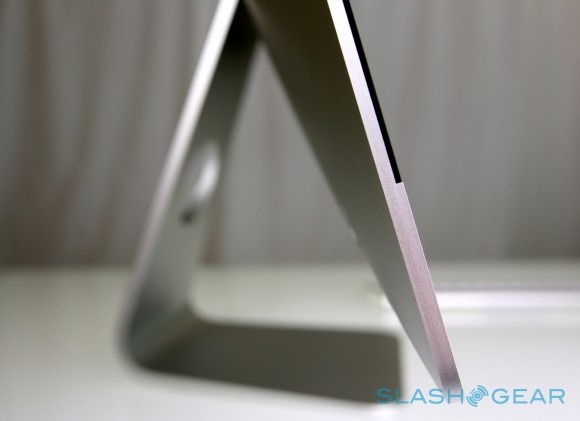 Face-on, meanwhile, and you'd be forgiven for not realizing that you were looking at a new iMac. The black screen bezel and slim aluminum chin look just as they did before, and it's only when you see things from the side that the new design stands out. The obvious loss from the blunt-edged last-gen model is the optical drive, with the 2012 iMac following the trend of the MacBook Air and MacBook Pro with Retina and focusing on digital distribution for apps and multimedia.
