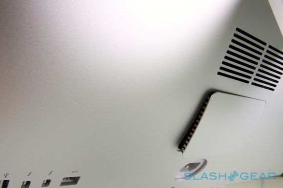 That accommodation and construction uses everything Apple has learned so far from unibody notebooks, scaled up to suit a 21.5-inch or bigger desktop. So, you get carefully stacked logic boards and custom speaker enclosures, along with a single central fan that pulls cool air from a row of holes under the front edge, and pushes it back out of vents behind the tilting stand. You also get minimal upgrade potential: the 21.5-inch iMac is an entirely closed box, with nothing intended to be user-accessible, while the 27-inch iMac has a small panel by the power socket that allows access to the memory but nothing else.