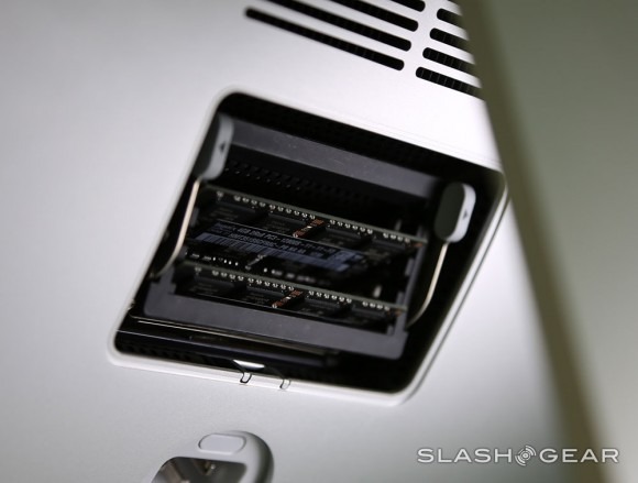 Memory is 8GB as standard across the range, comprising two 4GB 1600MHz DDR3 chips. The 21.5-inch iMac can be specified with up to 16GB, while the 27-inch iMac can go up to 32GB. However, only the 27-inch iMac has user-accessible memory slots: the four bays are accessed via a panel behind the stand, whereas the smaller iMac isn't intended to be user-upgraded. In short, if you think you'll ever want more than 8GB of memory on the 21.5-inch iMac, you should bite the bullet and upgrade at the point of purchase.