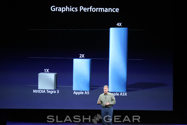 Tim Cook immediately went into talking about the NVIDIA Tegra 3 quad-core processor in all those Android tablets when talking about their own new A5X. After confirming the processor under the hood he revealed that the X stands for quad-core graphics. Graphics that are capable of around 4x the performance of the Tegra 3.
