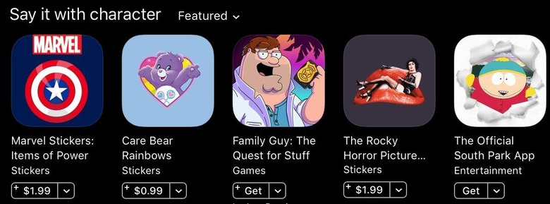 The packs range from food – including sushi, breakfast items, and ramen – through to Nyan Cat and The Very Hungry Caterpillar. Apple has plenty of character packs too, from Marvel and Disney franchises, cartoons such as Family Guy, South Park, and Garfield, and celebrity packs from Kim Kardashian and Ellen. They're generally priced from $0.99 to $1.99.
