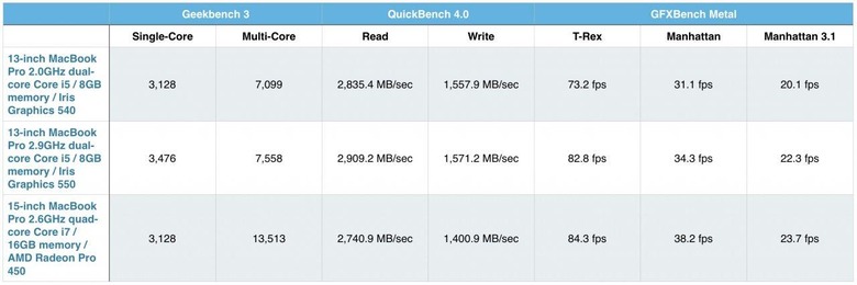 Apple has been pushing faster and faster solid-state storage in its notebooks for some generations now, and the new MacBook Pro line-up is no exception. Benchmark speeds were pretty consistent across all three models in QuickBench 4.0, hitting a hefty 2,909.2 MB/sec read and 1,571.2 MB/sec write at their fastest. Yes, Apple charges a fair amount to climb up through its SSD storage, but you can't argue with the performance.