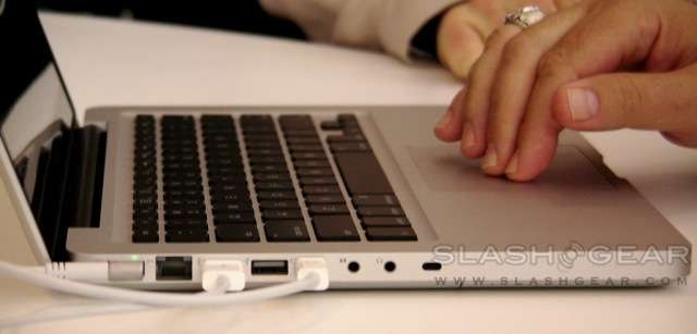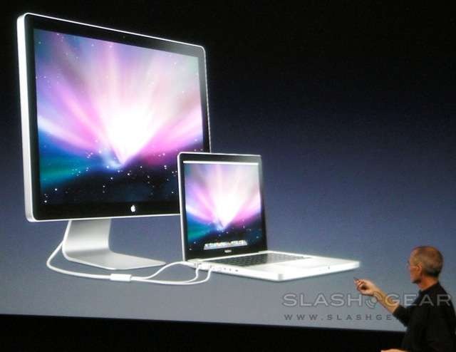 Ports have been shaken down to occupy only the left-hand side of the new MacBook, with both new additions and casualties along the way. Two USB 2.0 ports, a gigabit Ethernet port, audio in/out and the clever MagSafe power port remain, but DVI and FireWire have been jettisoned in favor of a new Mini Display Port. This fresh socket – not, as many are assuming, a proprietary Apple technology – earns its place by virtue of supporting higher resolutions (up to 2,560 x 1,600) and integrated audio than DVI can, but it's more usually a business connector and users may struggle to find as broad a choice of monitors with the port. Of course, Apple will happily sell you a 24-inch Cinema Display to use with it, also announced on Tuesday, but anybody else will have to stump up for the adapter cables. It seems cheap of Apple not to include at least one such adapter in the MacBook box.