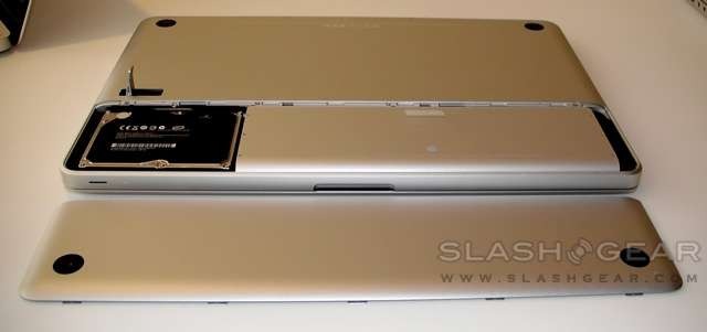 The 8x slot-loading SuperDrive lives on the right-hand side of the notebook, sadly not a Blu-ray drive since Apple believes the licensing issues too troublesome to navigate. The same old iSight camera, now hidden behind the glass bezel, lurks above the screen. Connectivity gains draft-n support and Bluetooth 2.1+EDR as standard, but there's no ExpressCard slot so 3G WWAN modems – still not offered as an integrated option by Apple themselves – will have to be USB. The relatively mediocre speakers from the previous MacBook are replaced with a far meatier, more satisfying pair, and there's a built-in Omni directional microphone for VoIP and video conferencing.