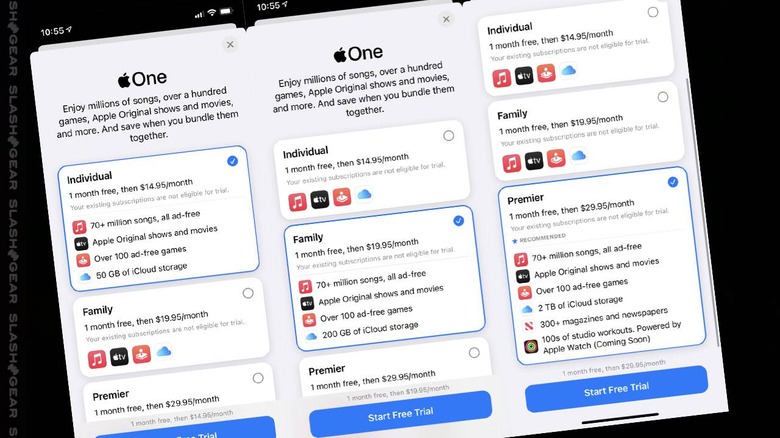 The Apple One subscription service appeared today with several different tiers of service. There's an Individual Plan, a Family Plan, and a Premier Plan. The whole lot starts with 1 month free, then moves on to pricing tiers per month at approximately $15, $20, and $30.