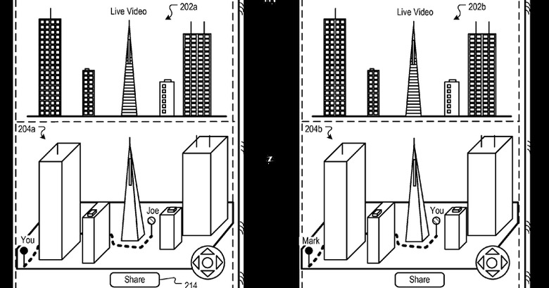 One of the patent filings, discovered by Apple Insider, was published for the first time today by the United States Patent and Trademark Office. The documents illustrate an augmented reality interface for the iPad that involves a split screen where the one above shows a live video while the one below shows a computer-generated or augmented version of the live video.