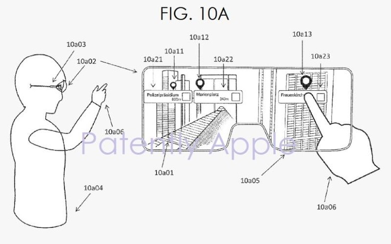 The patent details a technology that would (or could, at least) take things to the next level by adding a sort of touchscreen functionality to the glasses. In this case, a camera on the glasses could be used to identify where the user's finger is pointing in the environment, reacting to it as if the person were tapping the object or location on the actual glasses display.