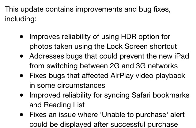 Apple is pushing out a new iOS update, 5.1.1. The new update is said to contain minor bug fixes and improvements, and is currently rolling out via iTunes as well as the Software Update/Over the Air function for iOS devices. The changelog lists several changes, including a HDR bug fix, 2G/3G issue for the new iPad, AirPlay fixes, and a purchase issue on the App Store.