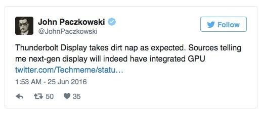 With little notice, Apple revealed it was killing-off its Thunderbolt Display earlier this week, with no announcement of a follow-up external monitor. While the device was five years old, and definitely showed its age next to the thinner, Retina display iMacs that followed it, the news was still disappointing to owners of various MacBook models that prefer to work on a larger screen when at home. However, it seems Apple may not be leaving the external display market altogether.BuzzFeed managing editor John Paczkowski has said that Apple is still working on a next-gen display, with unnamed sources indicating that it will feature its own integrated graphics card.