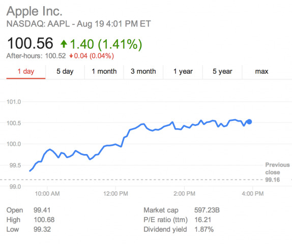 Earlier today Apple was granted a patent which fairly obviously suggested they would be creating a smartwatch in the near future. This patent number 8,808,483 does include "iPhone" in its description, but its claims do not assign it to a specific device, leaving it open to any similar device within reason – small enough for a smartwatch. Wallstreet thinks it's obvious enough, anyway, driving the stock to over $100 for the first time since the stock split in early June of this year.