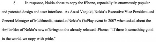 Update: Full legal text after the cut, plus Nokia's "copy with pride" quote about the iPhone comes back to haunt them