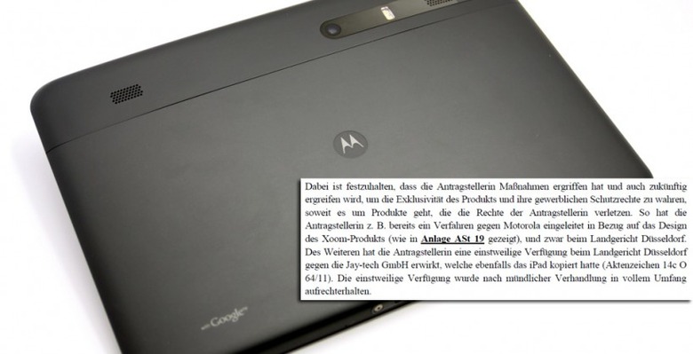 Details of the Apple preliminary injunction against Samsung's Galaxy Tab 10.1 have revealed that the Cupertino company is also targeting the Motorola XOOM in Europe, with a complaint already filed over the design of the Honeycomb slate. Although there's no confirmation that Apple is seeking a similar injunction against Motorola for European XOOM sales, FOSSPatents points to a third, local German tablet company, JAY-tech, which is also named in the paperwork and which has already been banned from selling its wares.
