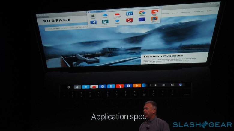 "The Touch Bar adapts to whatever software you're using," Apple's Phil Schiller said. Some of the demonstrated examples include the bar displaying browser bookmarks in Safari, along with buttons for search, back, and new tabs.