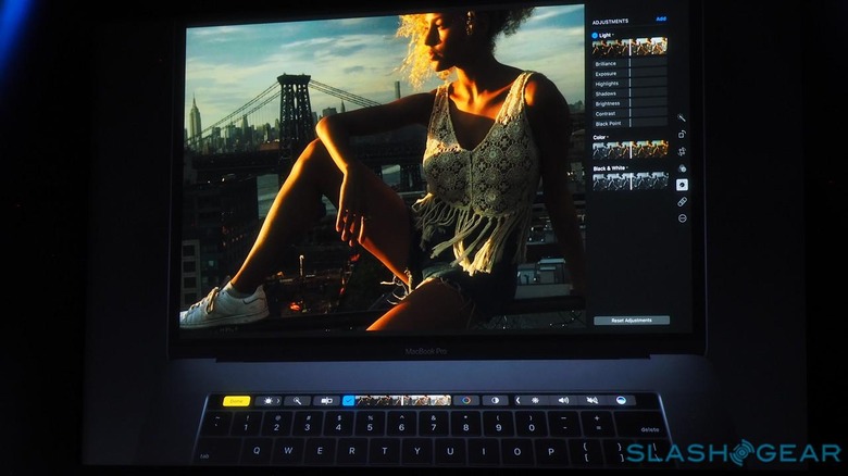 But the Touch Bar does more than just hot keys, it can also display an app's UI. This was shown off in Photos, with the Touch Bar showing a straightening tool. When writing an email, the bar will display spelling suggestions and predictive text, similar to iOS. iTunes, of course, displays volume and playback buttons.