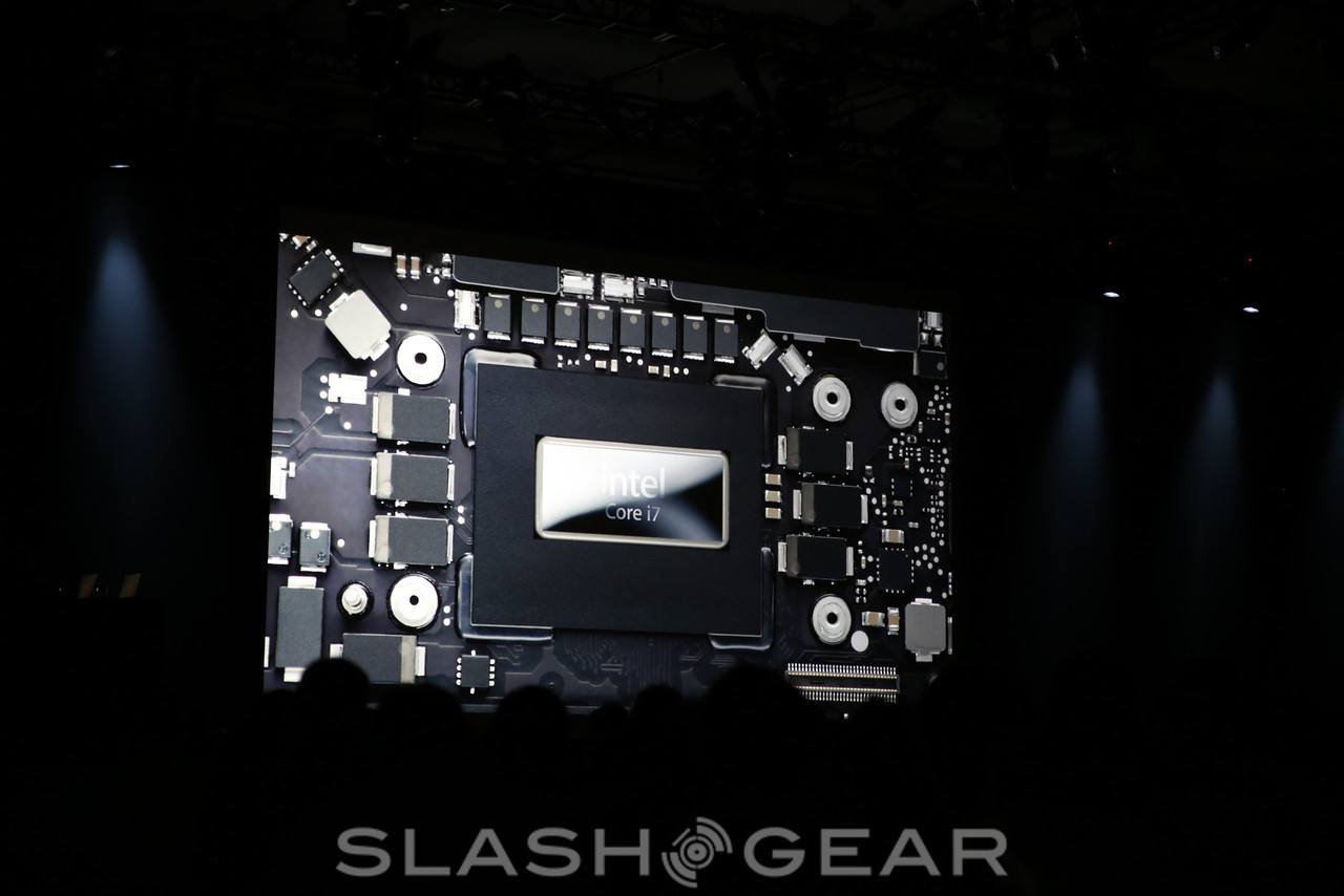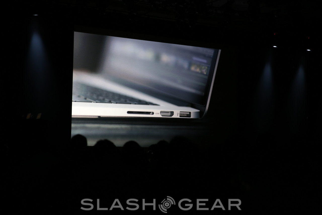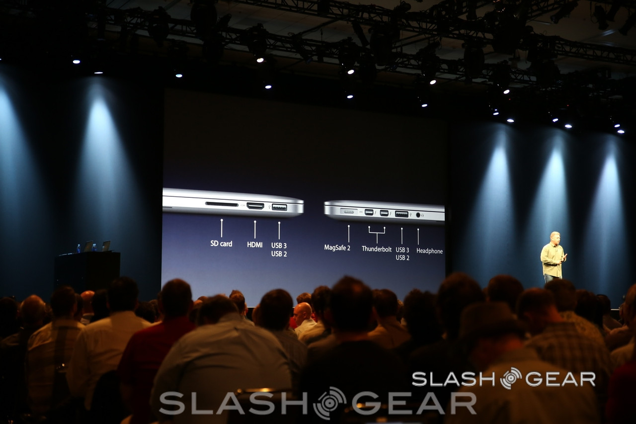 The design is very familiar to the current MacBook Pros, maintaining a constant case design instead of the taper on the airs. The next-gen MacBook Pro still makes room for plenty of horsepower, with an option for a Core i7 quad-core processor up to 2.7Ghz, 16GB of RAM, and an NVIDIA GT 650M GPU. On top of that, it can be configured for up to 768GB of SSD storage. In terms of ports, there's two USB 3.0 ports, HDMI, Thunderbolt, an SD card slot, and a new MagSafe 2 adapter, which has a reduced size over current offerings.