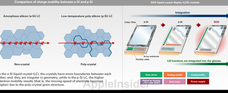 The LCD displays made by Sharp will feature a low-temperature poly-silicon technology, which will allow for a lighter and thinner display that will also consume less energy. These p-Si LCDs have thin film transistors (TFT) made of polycristalline silicon. Through this method, display drivers are mounted directly onto the glass substrate, thus reducing the TFT layer and making a thinner display. The p-Si display also has a higher aperture ratio that produces more vivid images, enhances durability, and reduces the amount of connecting pins.