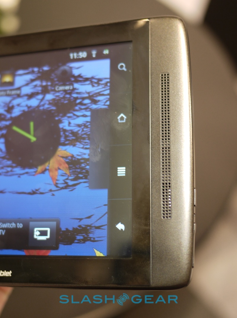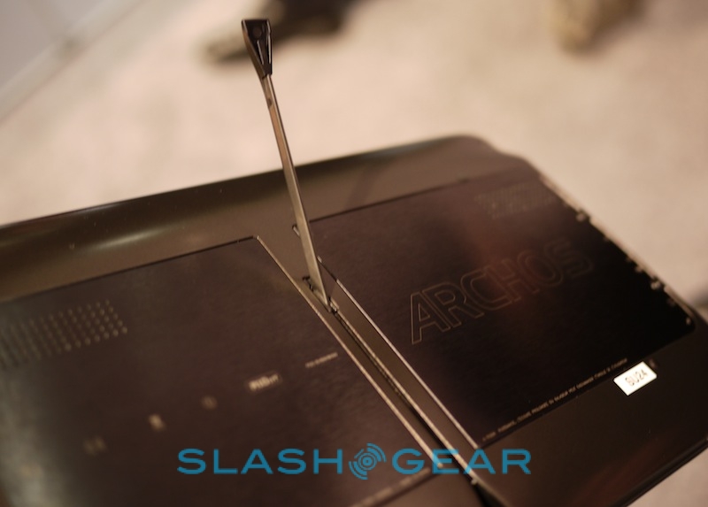 The Archos 101 is an interesting beast; at 12mm thick, it's very flat and, at 480 grams, surprising light, though the French company's choice of plastics mean it doesn't feel cheap. It also doesn't flex as you hold it, and there's a two-position kickstand on the back: first, it props it up for video viewing; second, it lowers the angle for more comfortable on-screen typing. Archos demonstrated a number of games on the slate, and the CPU could certainly keep up, using the accelerometer to navigate in racing titles.