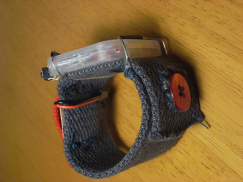 The knitted wristband is kept to the Arduino casing via bent paperclips, so hopefully Franklin won't be doing any strenuous exercise or jumping as it doesn't look the most stable of arrangements. More details on the Arduino Pro Mini here.