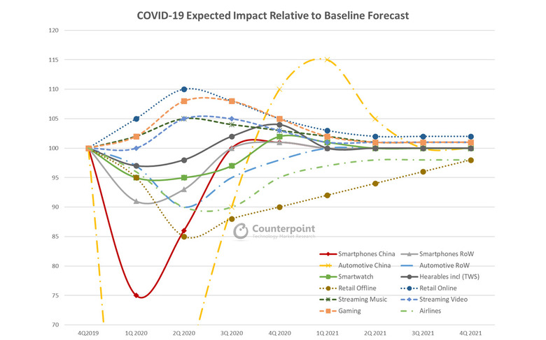 The two main risks involved in "material lowering" of the market's future potential are: "1. An extended global recession. Currently we are assuming a relatively sharp, but short recession, on a global basis," wrote Counterpoint researcher Peter Richardson. "2. A second wave of viral infections peaking in 4Q 2020 and 1Q 2021. Past pandemics have seen this double peak. COVID-19 may be the same."