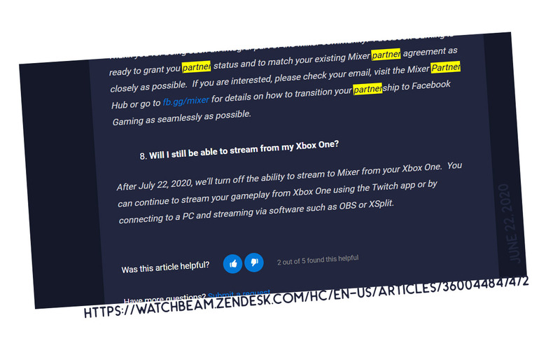 "After July 22, 2020," said Microsoft in their Mixer transition FAQ, "we'll turn off the ability to stream to Mixer from your Xbox One. You can continue to stream your gameplay from Xbox One using the Twitch app or by connecting to a PC and streaming via software such as OBS or XSplit."