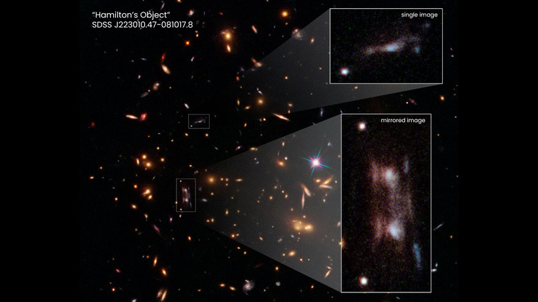 While scientists were surprised to discover the distant galaxy, more surprising was that the linear objects were exact copies of each other. That is a rare occurrence resulting from the precise alignment of the background galaxy and the lensing cluster in front of it. The object includes a pair of galaxy bulges, the central star-filled sections of a galaxy, and three nearly parallel split streaks.