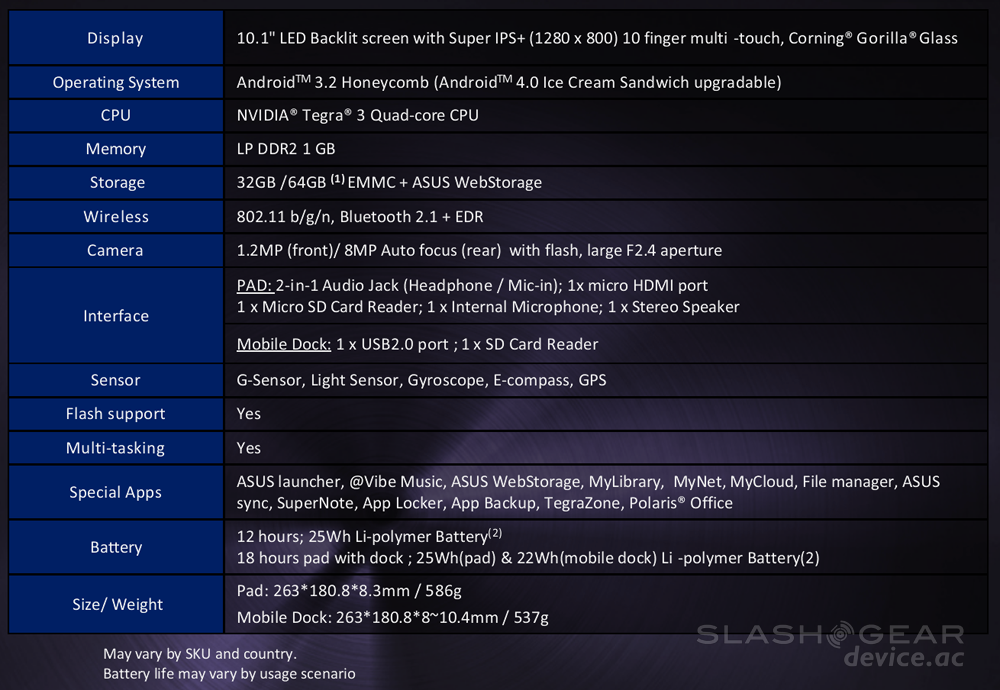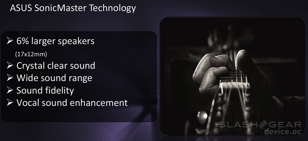 The Transformer Prime has SonicMaster technology to enhance its ability to blast out the audio. ASUS notes that it's got crystal clear sound, distinct vocal enhancements, and a wide sound stage – we'll have to see about that as well, no tablet has really TRULY impressed your humble narrator when it comes to onboard speakers so far, lets hope this breaks the curse.