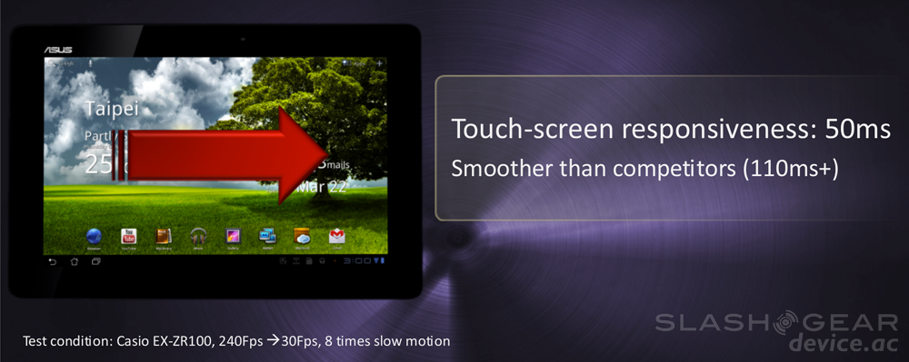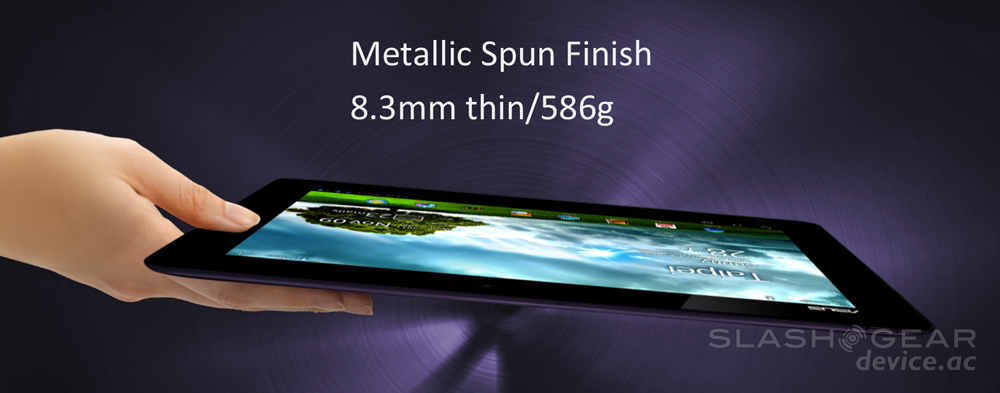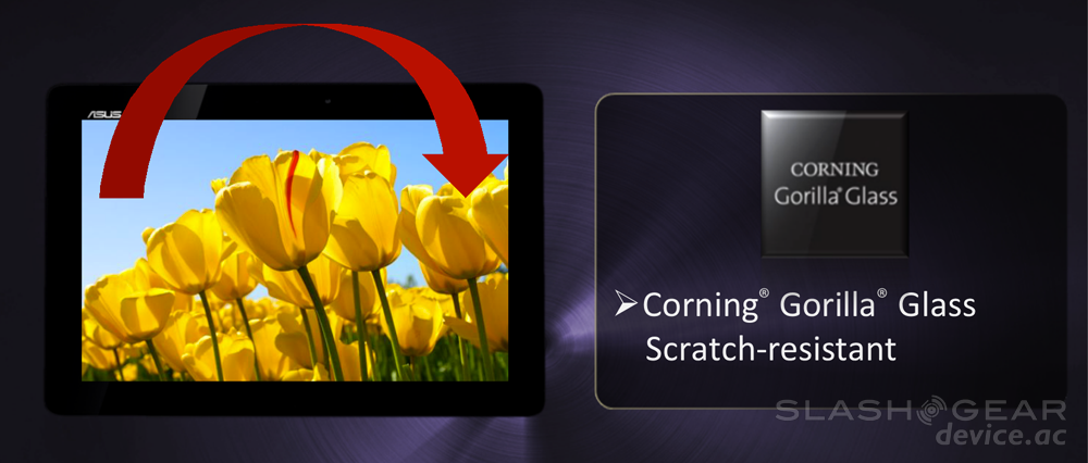 The back of the device is made of aluminum with a swirl design and two color options: Amethyst Gray or Champagne Gold. The display up front is covered with the ultra-strong and nearly impervious to damage Gorilla Glass from Corning, while the display is a 10.1-inch 1280 x 800 pixel Super IPS+ LCD. This display has what ASUS says is a wide 178° viewing angle and has, as ASUS puts it, "ASUS technology to enhance the brightness of the screen for a better outdoor reading experience while still offering a remarkably vivid and brilliant viewing experience of photos, books, videos, movies and web pages indoors." This technology is known as IPS+ mode and can be seen in the slide below – a whole new brightness indeed.