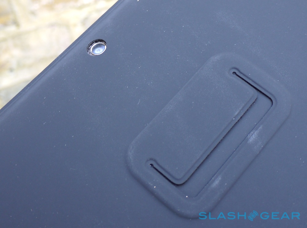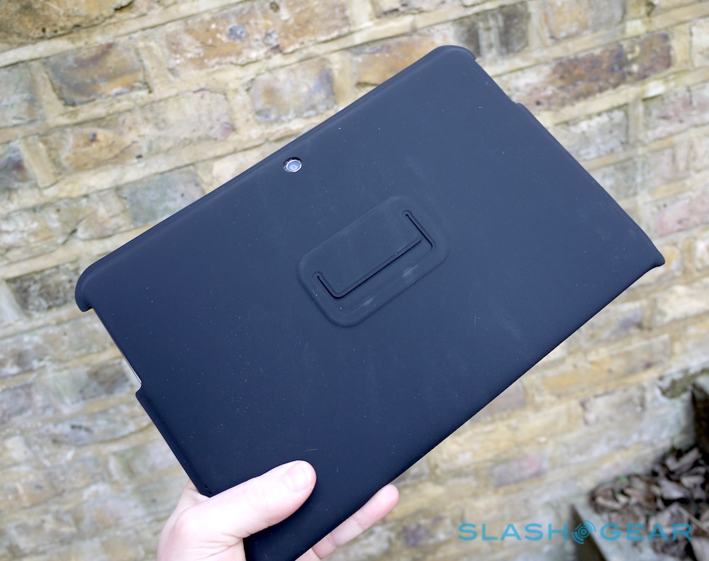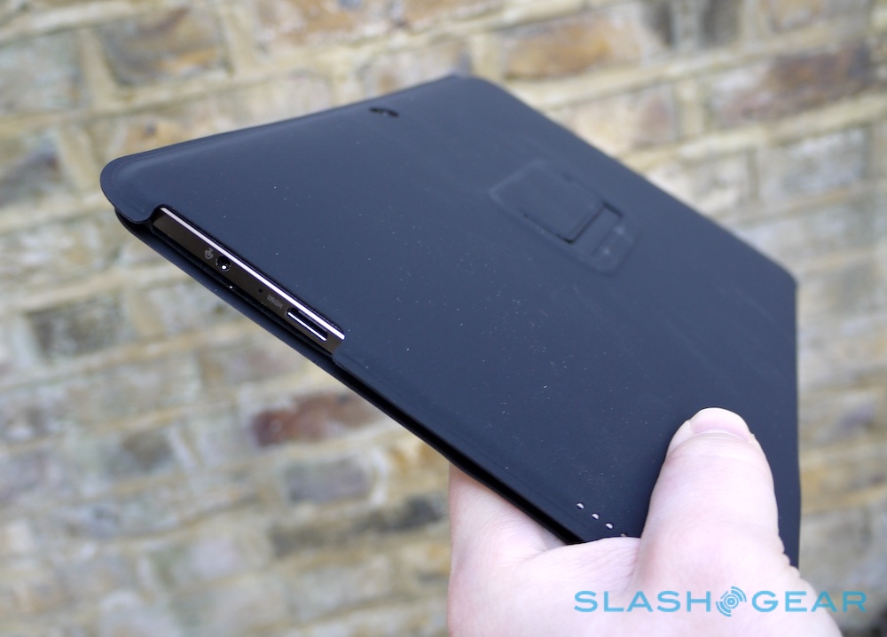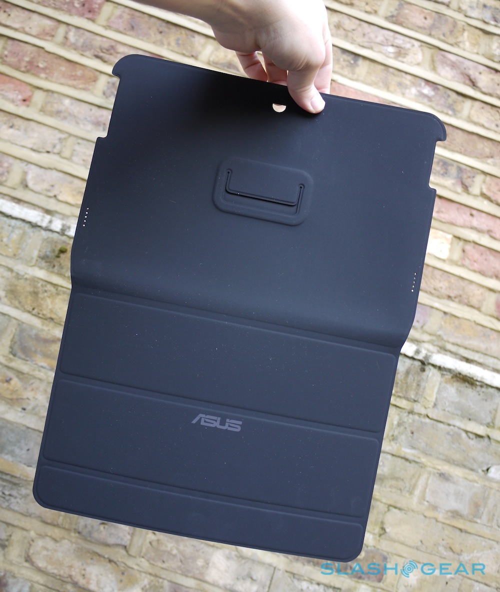 ASUS has provided cut-outs for almost all the ports: there's a slot in the flap for the power/sync cable, notches on both edges for the HDMI and headphones sockets, as well as the power/lock and volume keys. On the back is a hole for the 5-megapixel rear camera, so that you can shoot photos and video without removing the slate, while the front-facing webcam isn't covered by the case's bezel. In fact the only things blocked are the microSD card slot and the docking clamp holes along the bottom edge; even the speakers get a perfunctory double-line of holes so that you can hear them.