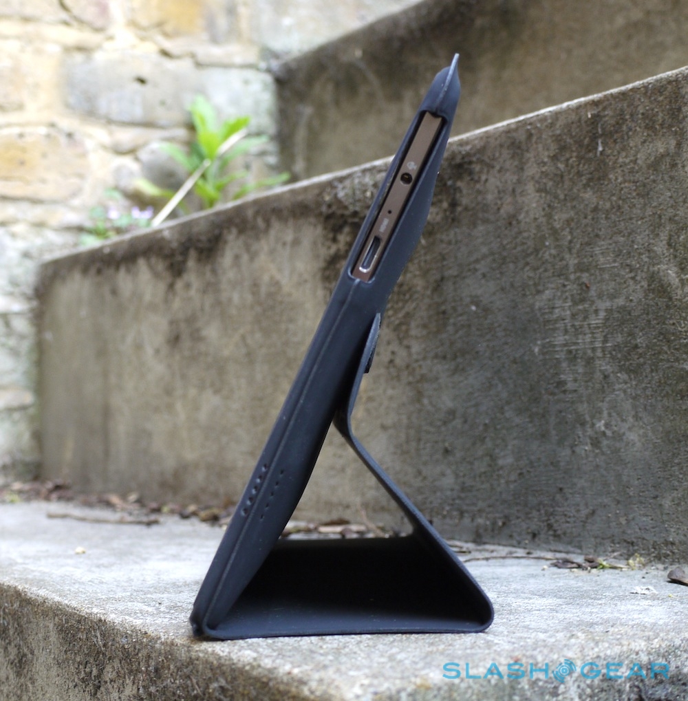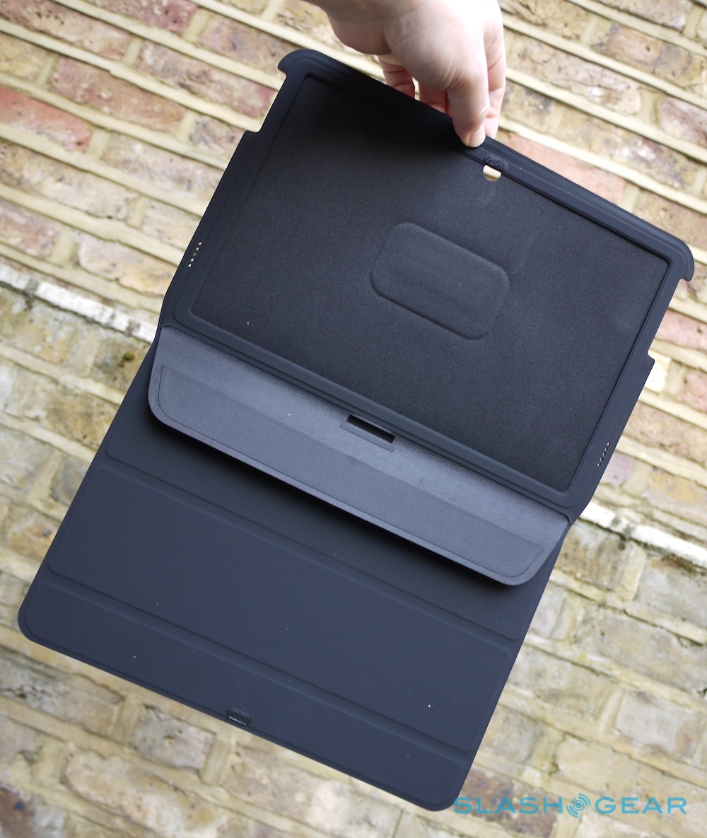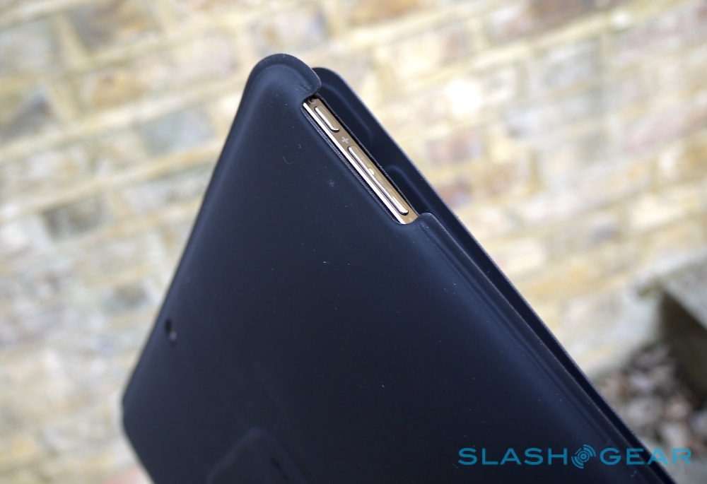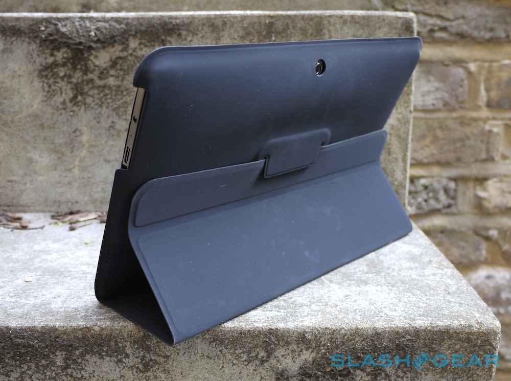 ASUS has provided cut-outs for almost all the ports: there's a slot in the flap for the power/sync cable, notches on both edges for the HDMI and headphones sockets, as well as the power/lock and volume keys. On the back is a hole for the 5-megapixel rear camera, so that you can shoot photos and video without removing the slate, while the front-facing webcam isn't covered by the case's bezel. In fact the only things blocked are the microSD card slot and the docking clamp holes along the bottom edge; even the speakers get a perfunctory double-line of holes so that you can hear them.