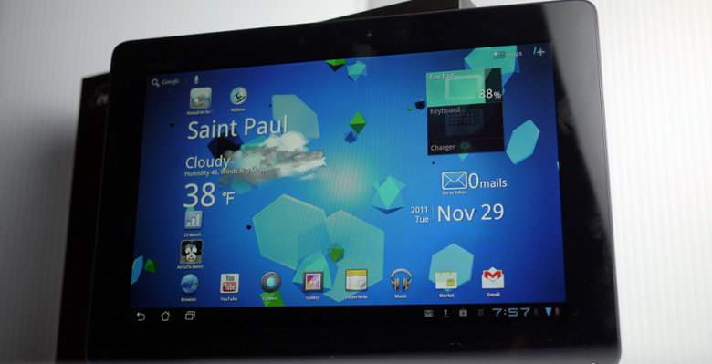 We won't go too deep into the products of the camera today, but know this: it's a vast improvement over most tablet-type camera toters your humble narrator has seen thus far. The camera interface remains mostly the same as your average Honeycomb shooter, as does most of the user interface, but ASUS has done an excellent job modifying the few bits that it has, including first of all the pop-up menu in the lower right-hand corner, it now including the all-important Super IPS button which will blast forth the brightness up to 600nits for outdoor reading.