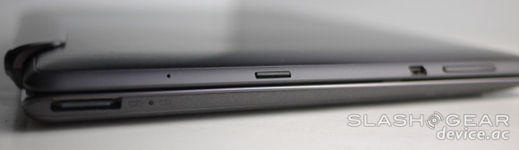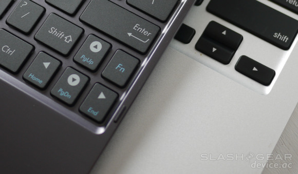 As far as the other side goes, the inside – for the fellow who asked: there are two little rubber bumpers on the keyboard side that hold the display away from the surface, but the Gorilla glass wouldn't have to worry about getting scratched either way because Gorilla Glass is more than tough enough to resist such smooth foe. Have a look here at a close-up view of the keyboard in all its glory in hands-on video Two: