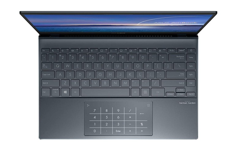 An IR webcam supports Windows Hello, and there's AI-powered noise cancelation on the ZenBook 13 OLED's microphone. The speakers use Harman Kardon tuning. Integrated into the touchpad, meanwhile, is an illuminated numberpad, which can be turned on for when you're working on spreadsheets and the like.