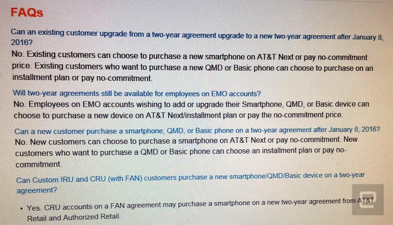 The information comes from leaked documents acquired by Engadget. According to the images, AT&T will be doing away with two-year contracts starting January 8, 2016, a little less than two weeks from now. The full details aren't known at this point; according to one of the screenshots, the company will provide more information to its workers "during the week of January 4, 2016."