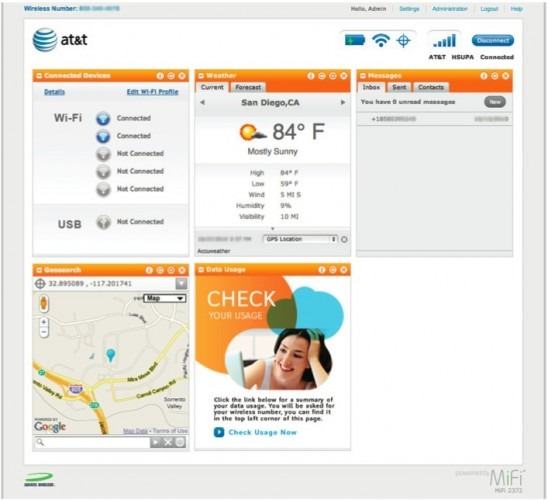 To make up for that shortcoming, there's an AT&T-branded landing page hosted by the MiFi itself, and accessible by visiting http://att.mifi on a WiFi-connected device (the default SSID and network key are printed on a label on the underside of the unit). The default "guest" page shows battery, network and GPS status, along with customizable widgets for things like weather forecasts (based on GPS position or your choice of location) and a geographic search with Google Maps powered data.