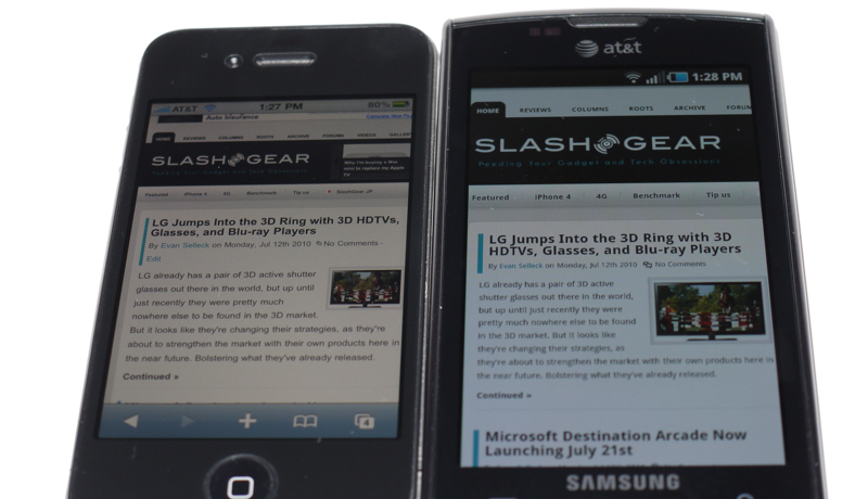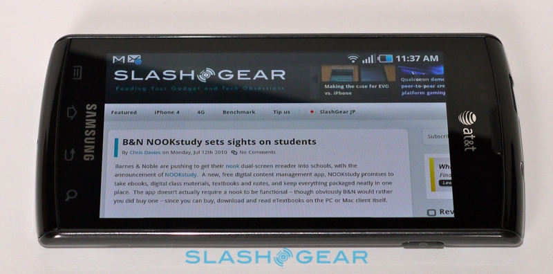 The Super AMOLED display remains eye-catching, with strong backlighting and vivid colors. It's obviously not as pin-sharp as the iPhone 4's Retina Display, but it's certainly among the best screens on an Android device right now. In bright, direct sunlight you'll still want to shade it with your hand, but generally outdoor visibility is improved over, say, the AMOLED of a Google Nexus One.