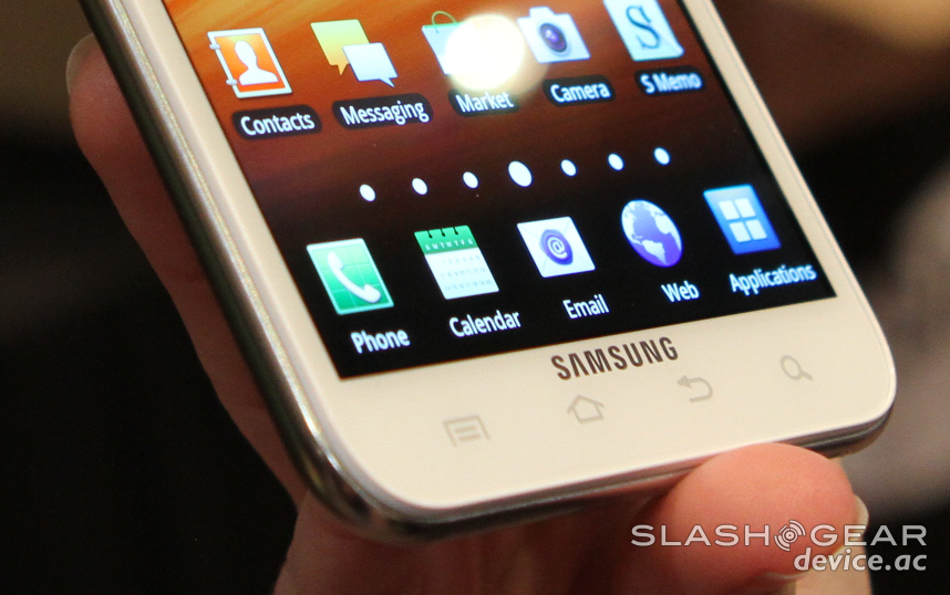As you'll notice right away, the capacitive buttons do light up as they do with many Android devices, but here with the white casing it creates an effect to be envied – glowtastic! Then there's the same awesome specifications you've all heard and know: a 5.3-inch Super AMOLED HS display at 1280 x 800 pixels, a Qualcomm Snapdragon 1.5GHz dual-core processor inside, and LTE speeds on AT&T. This device carries its own stylus which works marvelously with the device's own S-Memo application or for whatever other set of pen-positive apps you might desire to use.