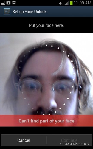 Face unlock has been activated for your lockscreen. This ability also works just as well as it does with the most updated version of Ice Cream Sandwich on the Galaxy Nexus (the only Android 4.0 Ice Cream Sandwich Nexus device on the market. Android 4.1 Jelly Bean updates this feature to be able to work with more than one photo of your face for added security, and this one does as well, but here you've only got to hold up a still photo of yourself to make the unlock work. In Jelly Bean, the unlock screen requires that you move your face and head to get in – this being called a Liveness Check – the Note doesn't quite have that yet.
