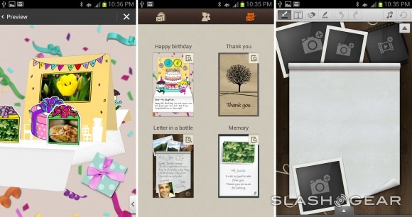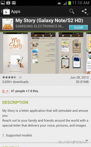 As a bit of a bonus it seems, both the Galaxy S III and the Galaxy Note have gotten access to a Samsung-promoted app that only works thus far on the two devices themselves. This app is called Samsung's My Story and it allows you to make greeting cards that can be shared to and from the app to other users also using the app. Inside the app you're able to add photos, change titles, and generally have an entertaining time fiddling around until you're ready to send it off to a friend whose also got a Galaxy S III or Galaxy Note. Samsung continues to build a vertically integrated system, piece by piece.