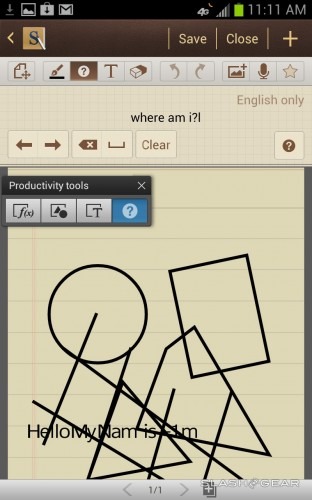 Starting with the app S-Note's new Productivity Tools, Samsung's suite of note and memo-taking apps has just gotten a bit sweeter. In the Productivity Tools you've now got, you can work with Formula Match, Shape Match, Handwriting-to-text, and Knowledge Search. You'll be using Wolfram Alpha for both formula and knowledge.